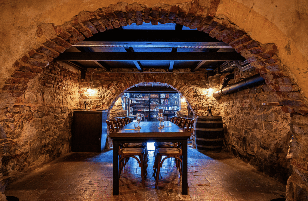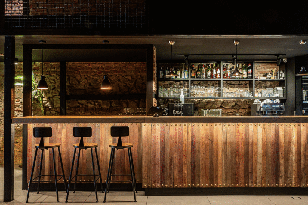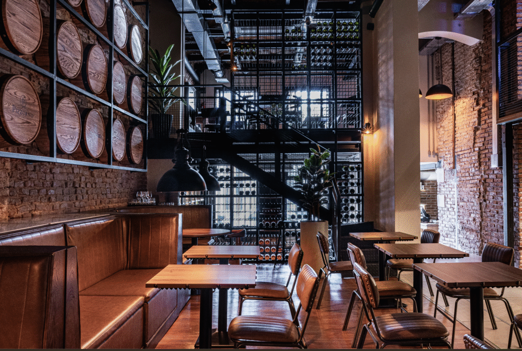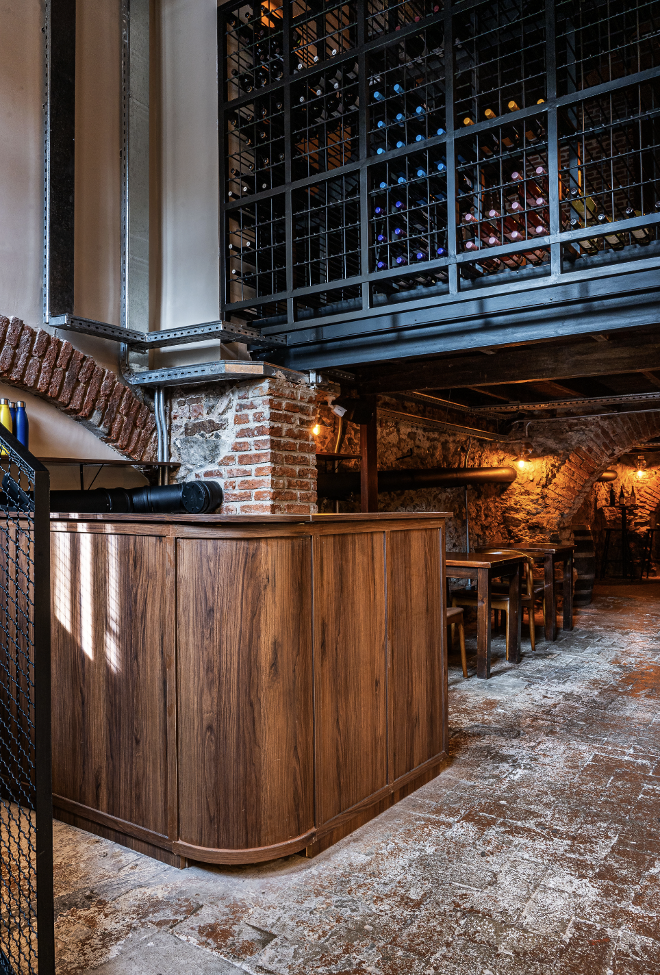 La intervención recupera la amplitud original del edificio, manteniendo sus arcos y trabajando con materiales nobles como ladrillo y piedra para reinterpretar el lenguaje de bodega en clave urbana.