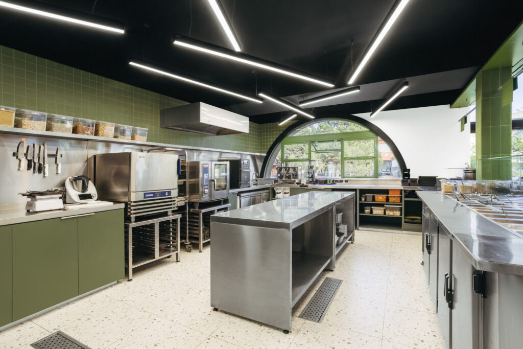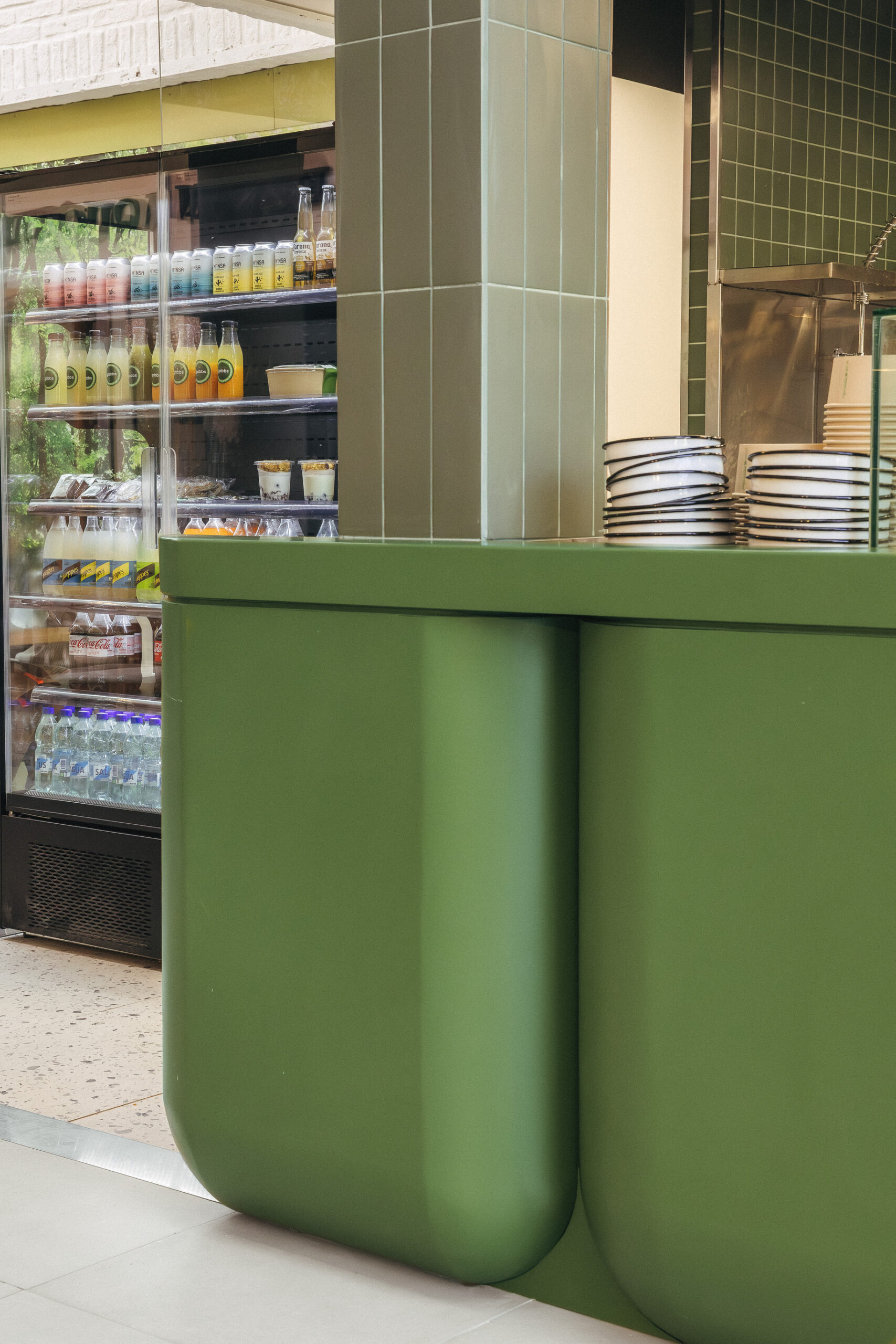 El proyecto partió de una barra continua como pieza central, que estructura cocina, cafetería y área de elaboración en dos niveles, optimizando el uso del espacio. La morfología orgánica del mobiliario contrasta con la rigidez del contexto comercial, generando fluidez y un recorrido que integra todos los usos. El verde predominante, elegido como color identitario, refuerza una imagen fresca y distintiva en un entorno neutro.