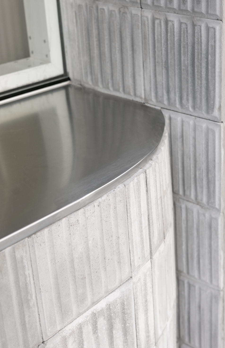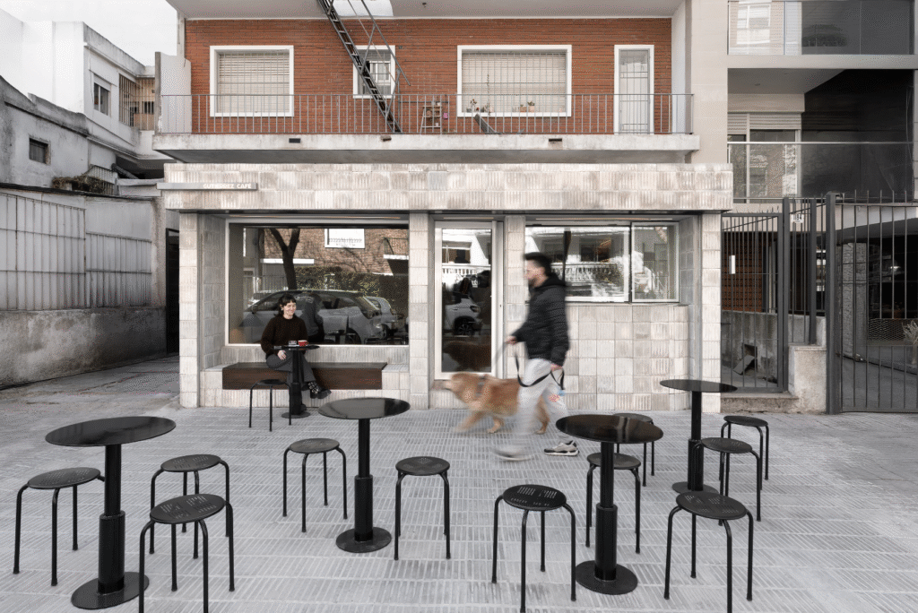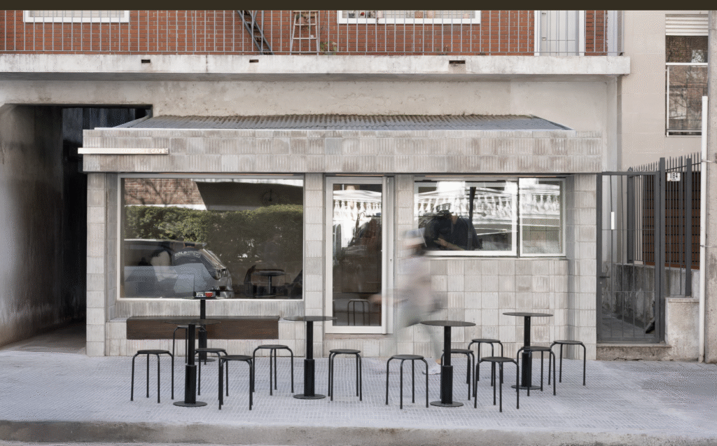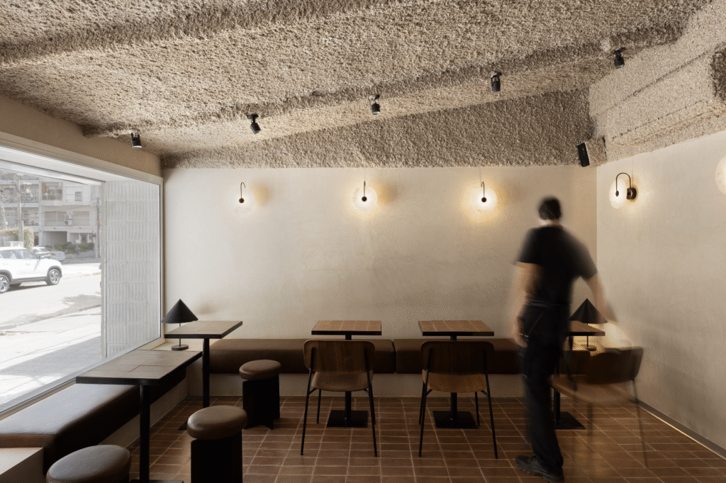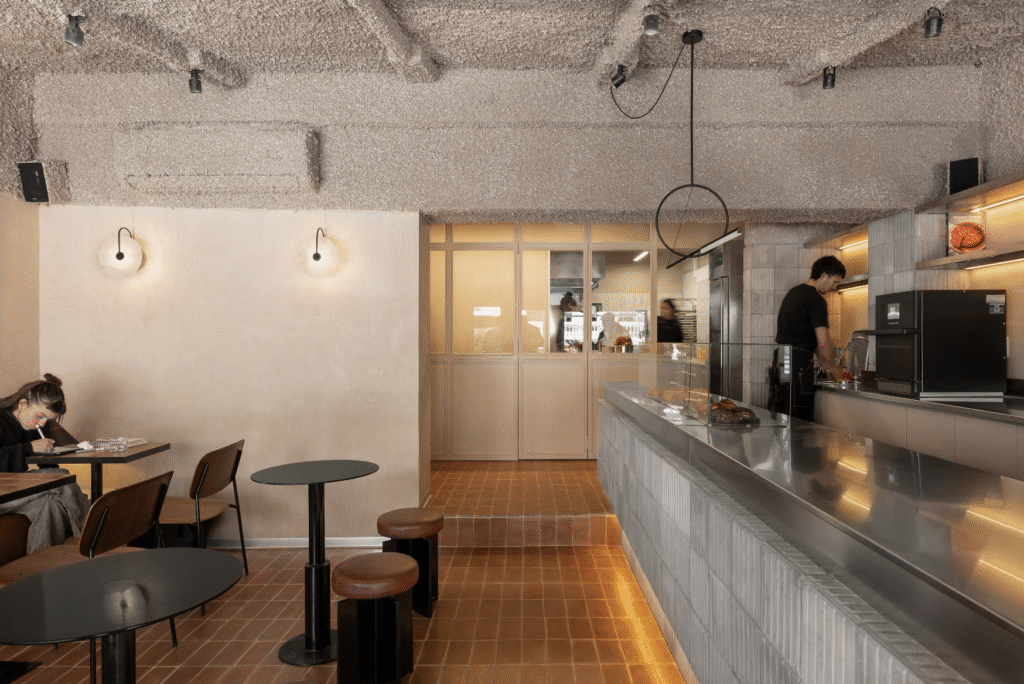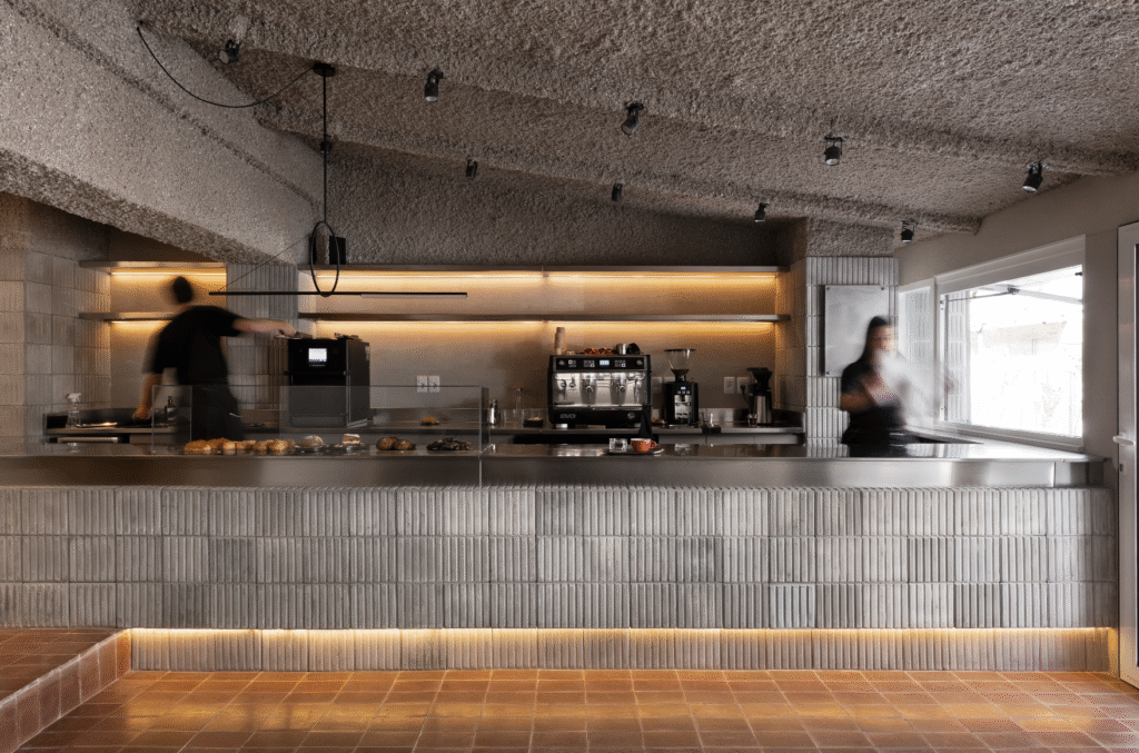 Desde la entrada, la barra principal de acero inoxidable articula la circulación, separa el área de atención y conecta visualmente con la cocina a la vista, donde la preparación de los productos se convierte en parte de la experiencia.
